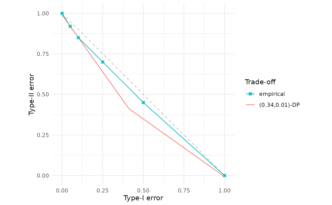 A \((\varepsilon, \delta)\)-DP trade-off function object (see epsdelta()) of class c("fdp_epsdelta_tradeoff", "function").