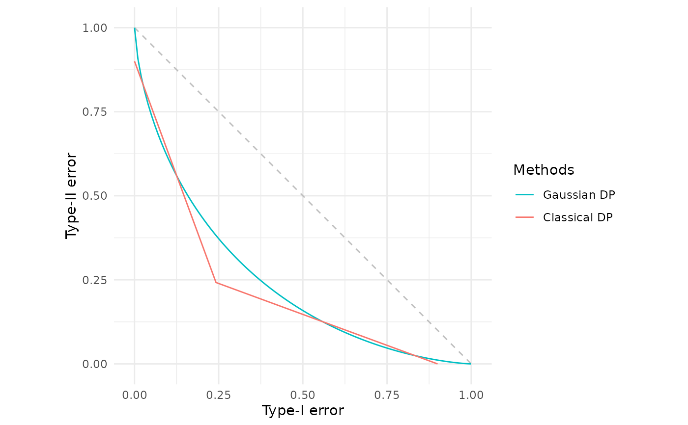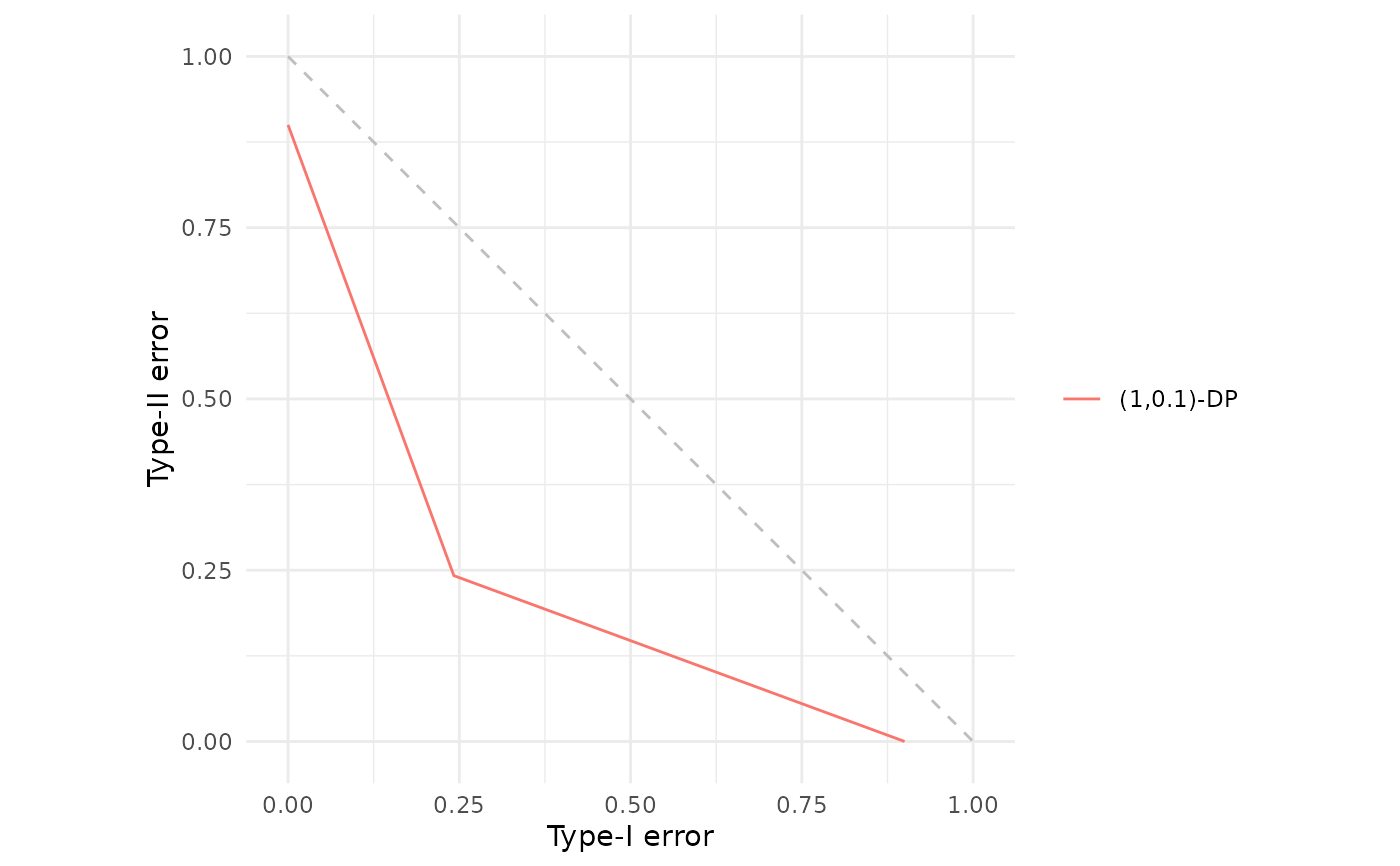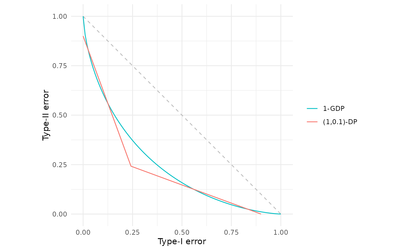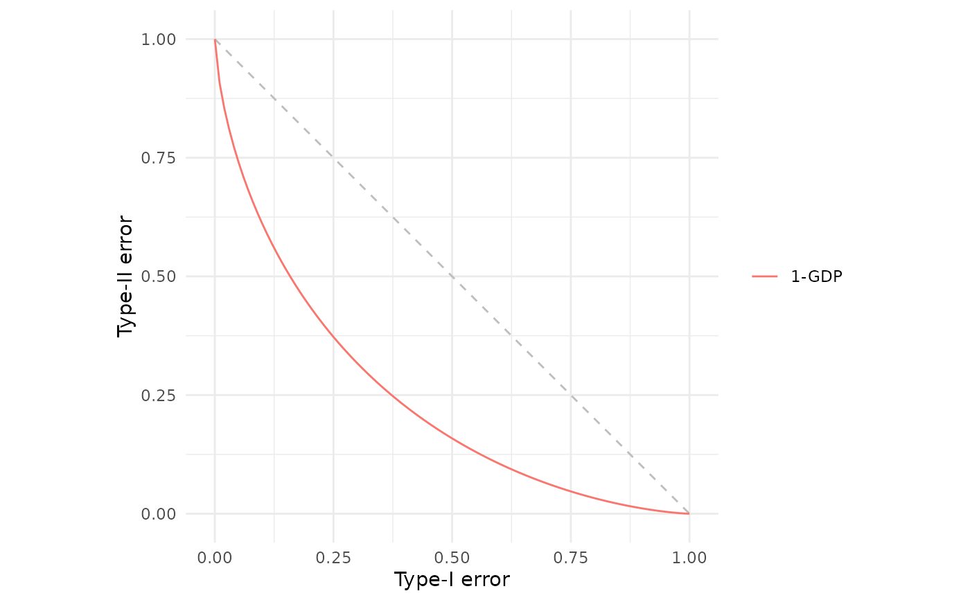 my_fdp <- 1 - awould then produce the (unrealistic) perfect f-DP privacy curve by calling fdp(my_fdp).